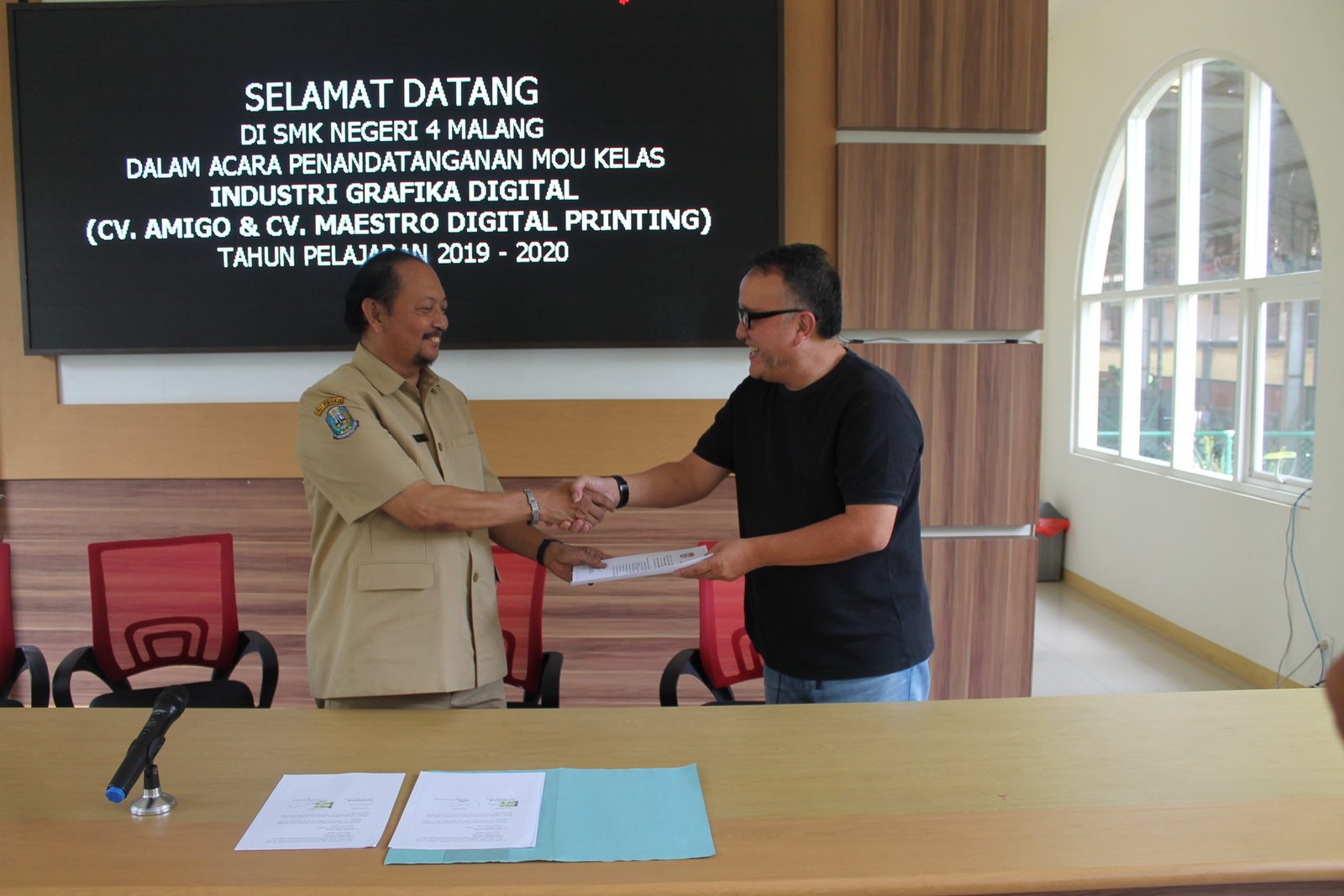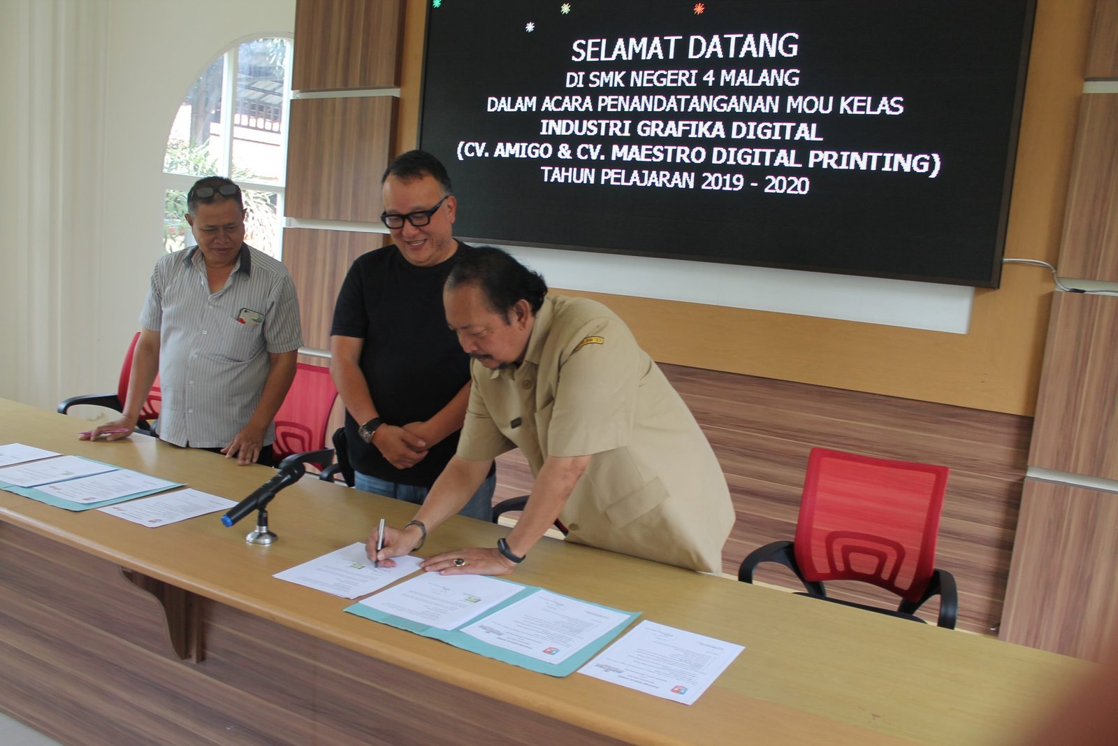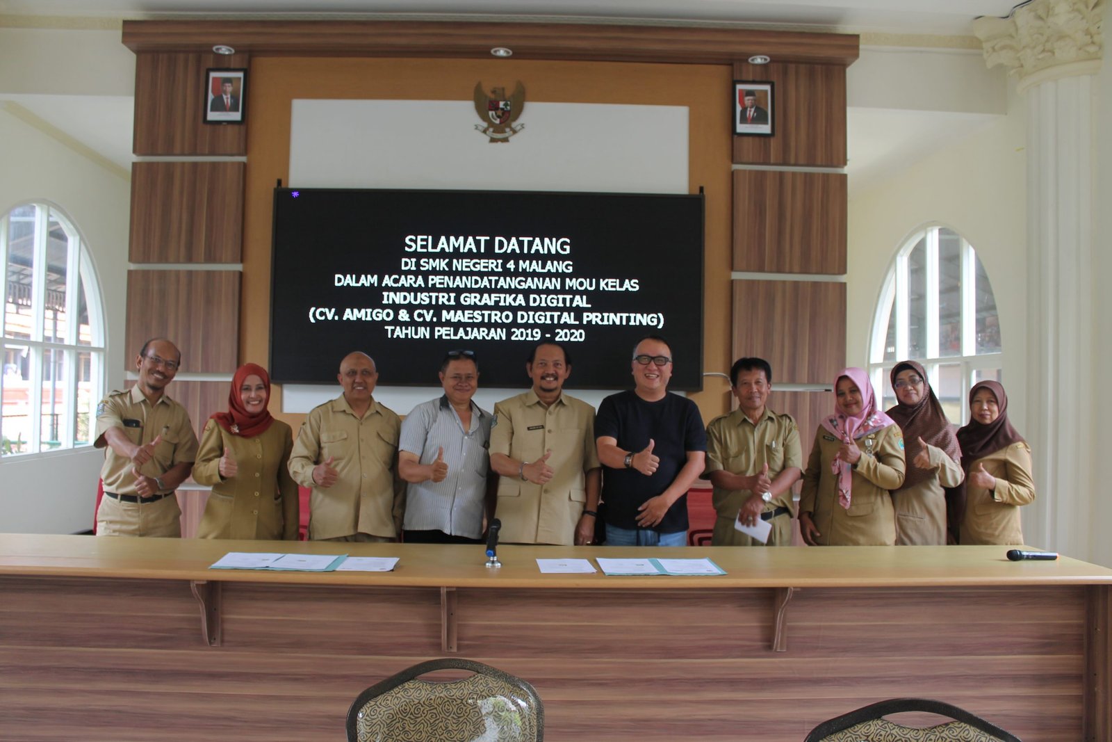 MALANG – Senin, 13 Januari 2020, SMKN 4 Malang melakukan kerjasama dengan CV. Amigo & CV. Maestro Digital Printing dengan tujuan membuat kelas digital. Penandatanganan tersebut dilakukan Hall lantai 2 SMKN 4 Malang dengan dihadiri Bapak Wadib selaku Kepala Sekolah dan bapak ibu Waka serta perwakilan dari kedua CV.